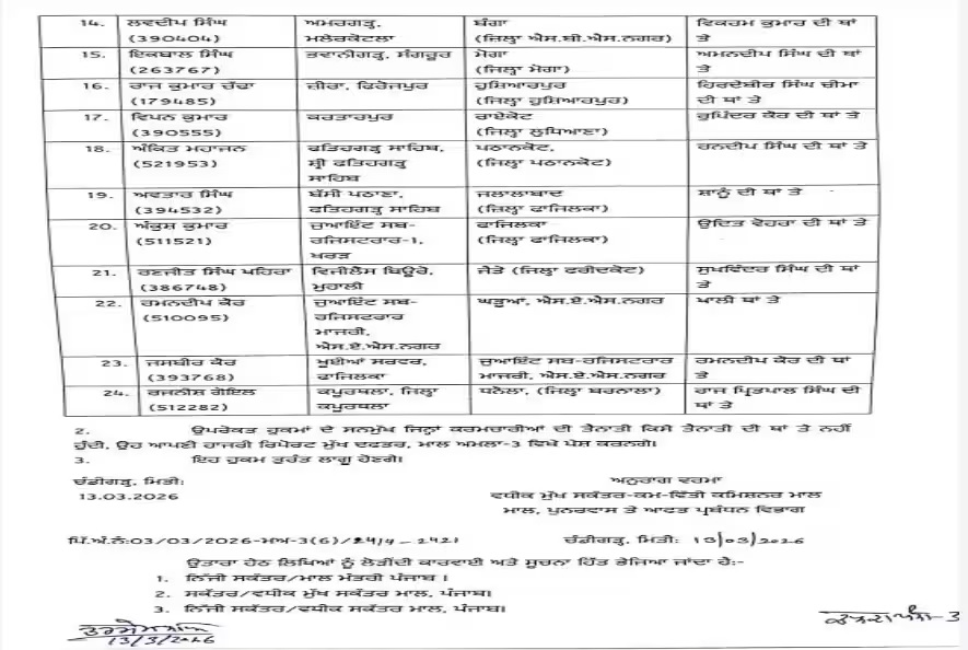 ਪ੍ਰਸ਼ਾਸਨਿਕ ਤਬਾਦਲੇ ਵਿੱਚ ਕੁਝ ਅਹਮ ਨਾਮ ਸ਼ਾਮਿਲ ਹਨ ਜਿਵੇਂ ਕਿ ਤਹਿਸੀਲਦਾਰਾਂ ਅਤੇ ਨਾਇਬ ਤਹਿਸੀਲਦਾਰਾਂ ਦੇ ਅਹੁਦਿਆਂ 'ਤੇ ਤਬਾਦਲਾ ਕੀਤਾ ਗਿਆ ਹੈ। ਇਹ ਤਬਾਦਲੇ ਪੰਜਾਬ ਸਰਕਾਰ ਦੀ ਮੰਤਵਨਾ ਦਾ ਹਿੱਸਾ ਹਨ ਜੋ ਵਿਭਾਗਾਂ ਦੀ ਕਾਰਗੁਜ਼ਾਰੀ ਨੂੰ ਤੇਜ਼ ਕਰਨ ਅਤੇ ਲੋਕਾਂ ਨੂੰ ਬਿਹਤਰ ਸੇਵਾਵਾਂ ਪ੍ਰਦਾਨ ਕਰਨ ਲਈ ਕੀਤੇ ਗਏ ਹਨ।