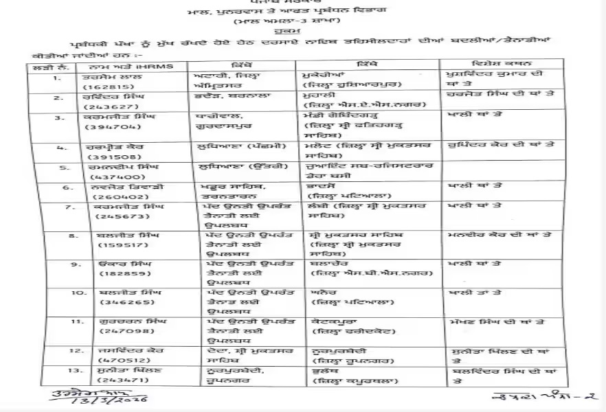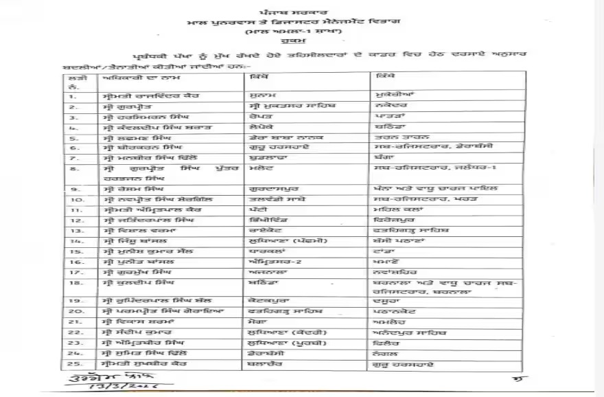 ਪੰਜਾਬ ਵਿੱਚ ਅਧਿਕਾਰੀਆਂ ਦੇ ਤਬਾਦਲੇ ਦੀ ਲਹਿਰ ਜਾਰੀ ਰਹੀ ਹੈ, ਜਿਸ ਵਿੱਚ ਅੱਜ ਪੰਜਾਬ ਸਰਕਾਰ ਨੇ ਵੱਡੇ ਪ੍ਰਸ਼ਾਸਨਿਕ ਫੇਰਬਦਲ ਕੀਤੇ। ਇਸ ਤਬਾਦਲੇ ਵਿੱਚ ਤਹਿਸੀਲਦਾਰਾਂ ਅਤੇ ਨਾਇਬ ਤਹਿਸੀਲਦਾਰਾਂ ਦੀਆਂ ਜਗ੍ਹਾਵਾਂ ਵਿੱਚ ਬਦਲਾਅ ਕੀਤੇ ਗਏ ਹਨ। ਇਨ੍ਹਾਂ ਫੇਰਬਦਲਾਂ ਦਾ ਮਕਸਦ ਸਰਕਾਰੀ ਕੰਮਕਾਜ ਵਿੱਚ ਸੁਧਾਰ ਅਤੇ ਪ੍ਰਸ਼ਾਸਨਿਕ ਤੱਤਾਂ ਨੂੰ ਹੋਰ ਪ੍ਰભાવਸ਼ਾਲੀ ਬਣਾਉਣਾ ਹੈ।