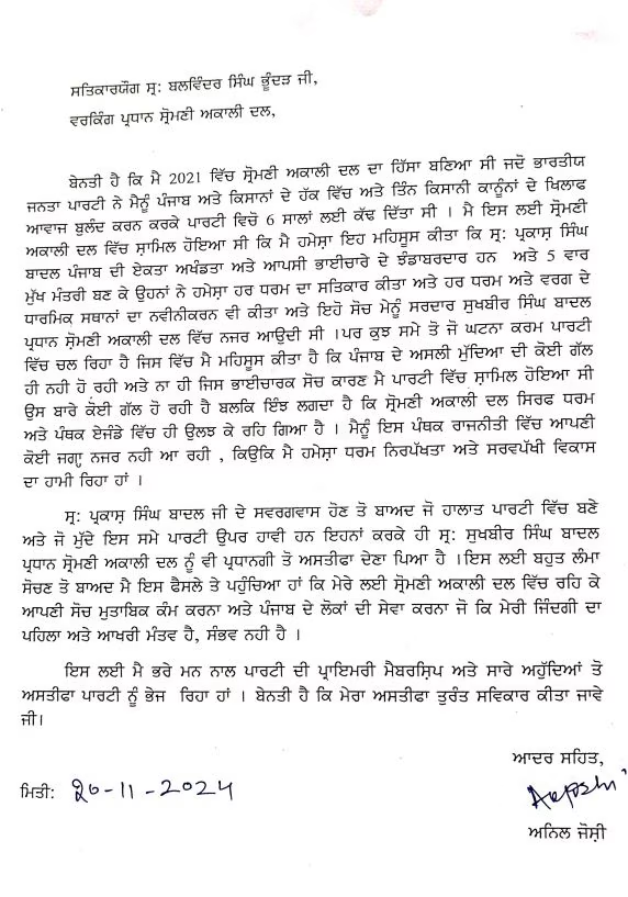 ਸ਼੍ਰੋਮਣੀ ਅਕਾਲੀ ਦਲ ਨੂੰ ਇਕ ਹੋਰ ਝਟਕਾ ਲੱਗਾ ਹੈ। ਸੀਨੀਅਰ ਆਗੂ ਅਨਿਲ ਜੋਸ਼ੀ ਨੇ ਅਕਾਲੀ ਦਲ ਦੀ ਮੁਢਲੀ ਮੈਂਬਰਸ਼ਿਪ ਤੋਂ ਅਸਤੀਫਾ ਦੇ ਦਿੱਤਾ ਹੈ। ਉਹ 2022 ਵਿਚ ਅਕਾਲੀ ਦਲ ਵੱਲੋਂ ਵਿਧਾਨ ਸਭਾ ਚੋਣ ਲੜ ਚੁੱਕੇ ਹਨ। ਦੱਸ ਦਈਏ ਕਿ ਇਸ ਤੋਂ ਪਹਿਲਾਂ ਸੁਖਬੀਰ ਬਾਦਲ ਦੇ ਅਸਤੀਫ਼ੇ ਕਾਰਨ ਕਈ ਆਗੂਆਂ ਵੱਲੋਂ ਪਾਰਟੀ ਛੱਡਣ ਦਾ ਐਲਾਨ ਕਰ ਦਿੱਤਾ ਸੀ। ਅਨਿਲ ਜੋਸ਼ੀ ਵੱਲੋਂ ਸ਼੍ਰੋਮਣੀ ਅਕਾਲੀ ਦਲ ਦੀ ਮੁਢਲੀ ਮੈਂਬਰਸ਼ਿਪ ਤੇ ਸਮੂਹ ਅਹੁਦਿਆਂ ਤੋਂ ਅਸਤੀਫੇ ਦਾ ਐਲਾਨ ਕਰ ਦਿੱਤਾ ਹੈ।