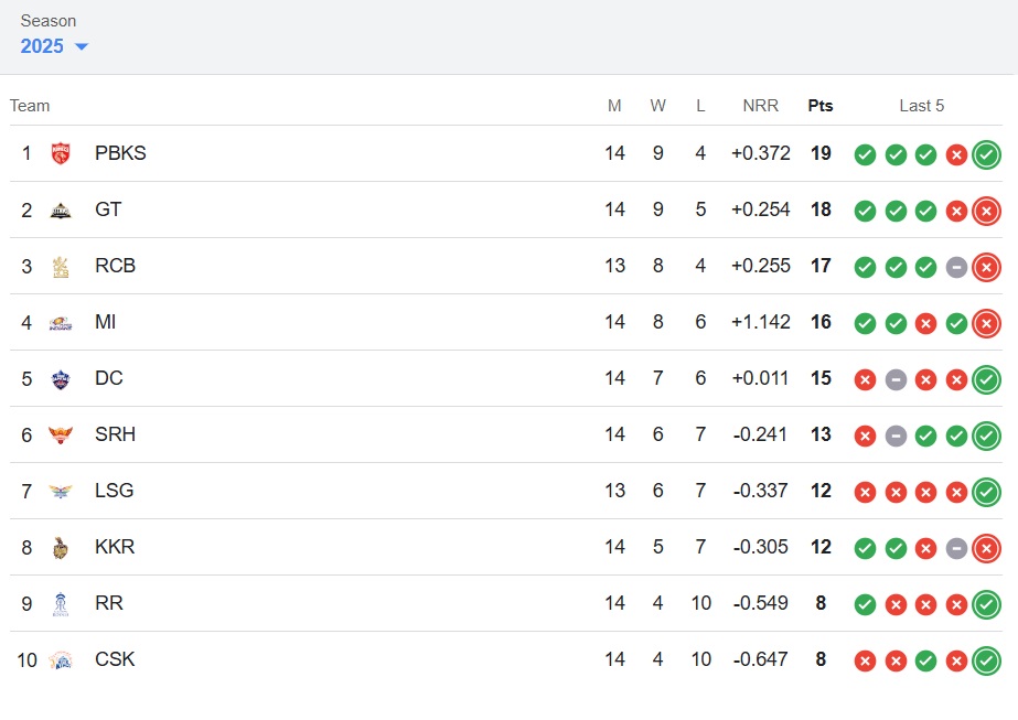 ਪੰਜਾਬ ਕਿੰਗਜ਼ ਨੇ ਮੁੰਬਈ ਇੰਡੀਆੰਸ ਨੂੰ 7 ਵਿਕਟਾਂ ਨਾਲ ਹਰਾ ਦਿੱਤਾ ਹੈ। ਇਸ ਜਿੱਤ ਨਾਲ ਪੰਜਾਬ ਹੁਣ IPL 2025 ਦੀ ਪੁਆਇੰਟਸ ਟੇਬਲ ਵਿੱਚ ਪਹਿਲੇ ਸਥਾਨ 'ਤੇ ਪਹੁੰਚ ਗਈ ਹੈ। ਇਸ ਮੈਚ ਵਿੱਚ ਮੁੰਬਈ ਨੇ ਪਹਿਲਾਂ ਖੇਡਦਿਆਂ 184 ਰਨ ਬਣਾਏ ਸਨ, ਜਿਸਦੇ ਜਵਾਬ ਵਿੱਚ ਪੰਜਾਬ ਨੇ 18.1ਵੇਂ ਓਵਰ ਵਿੱਚ ਹੀ ਜਿੱਤ ਹਾਸਲ ਕਰ ਲਈ। ਪੰਜਾਬ ਕਿੰਗਜ਼ ਵੱਲੋਂ ਪ੍ਰਿਆਂਸ਼ ਆਰੀਆ ਅਤੇ ਜੋਸ਼ ਇੰਗਲਿਸ਼ ਨੇ ਅੱਧੇ ਸੈਂਕੜੇ ਜੜ੍ਹੇ।